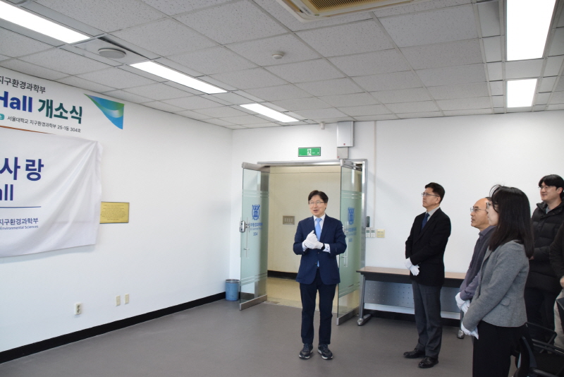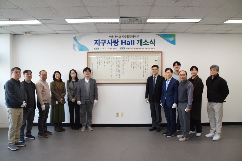 이상만 교수님께서 지질전공에 기증해 주신 지구사랑 시 및 서예작품(2008년 유엔이 정한 지구의 해 헌정시)을 지구환경과학부 메인홀인 25-1동 304호에 상설 전시하게 되었습니다. 작품 전시를 위해 25-1동 304호를 "지구사랑 Hall"로 개명하여 현판을 붙이고 지구사랑홀 개소 및 이상만 교수님 작품 상설전시를 기념하는 개소식을 2026년 2월 23일에 자연대 학장님과 지질전공 교수님들께서 참석한 가운데 진행하였습니다.다시 한 번 이상만 교수님의 뜻깊은 작품 기증에 감사드립니다.
