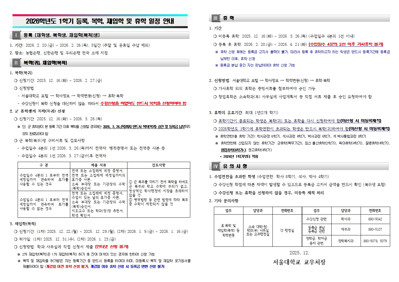 [일반공지] 2026학년도 1학기 등록, 복학, 재입학 및 휴학 일정 안내
