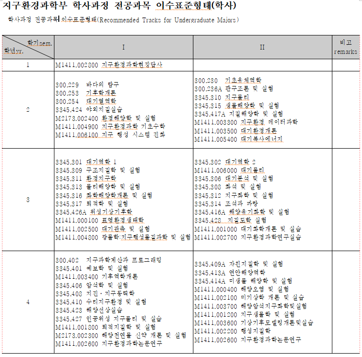 최근 교과과정 변경을 반영한 지구환경과학부 <이수표준형태>를 아래와 같이 안내드리오니, 수강계획에 참고하여 주시기 바랍니다.