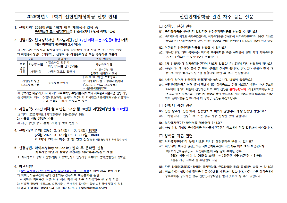 - 1. 2026학년도 1학기 선한인재장학금 신청 안내(학생안내용).hwp (78 KB, download:1)