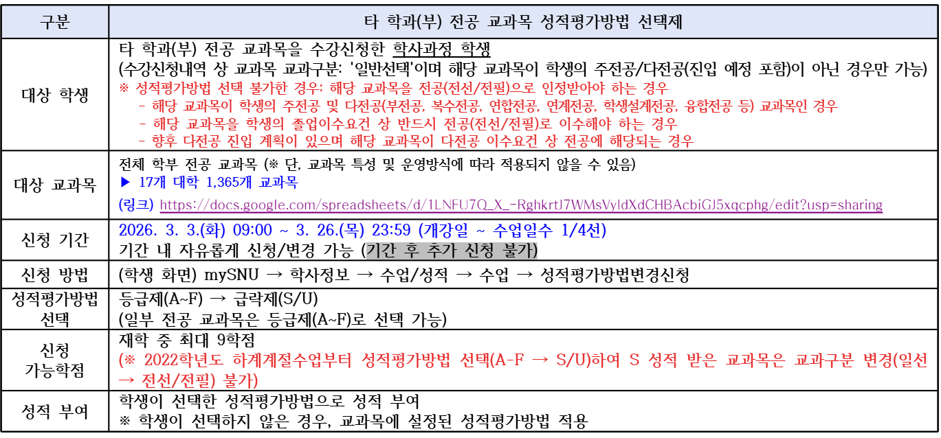 [수업] 2026학년도 1학기 타 학과(부) 전공 교과목 성적평가방법 선택제 신청 안내